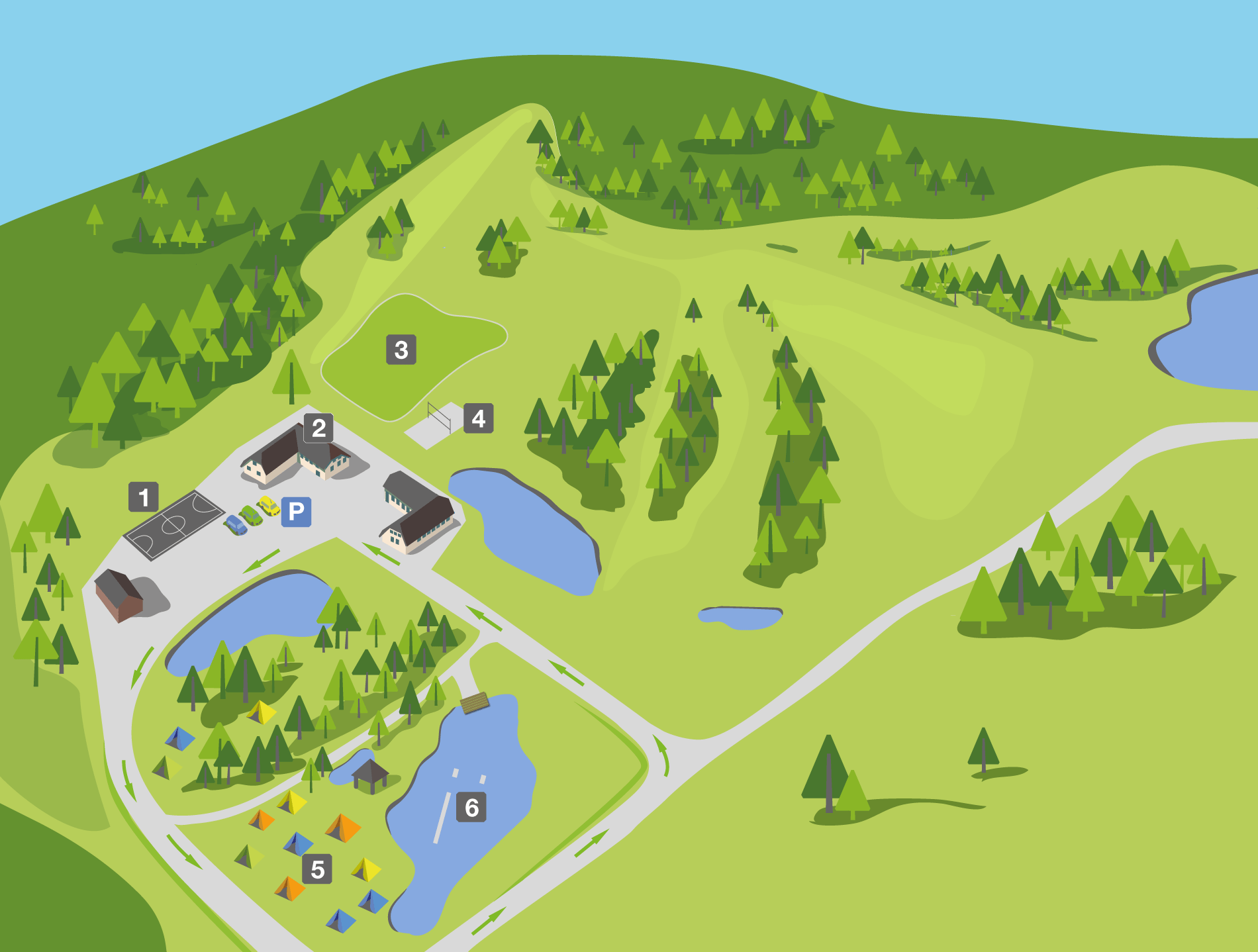 Apskatīt ziemas karti 1 Basketbola un tenisa laukums 2 Viesnīca un telpas pasākumiem 3 Laukums futbolam vai citām aktivitātēm 4 Volejbola laukums 5 Telšu vietas 6 Veikborda dīķis ar lineāro kabeli Autostāvvietas Veikbords Aktīvas un laiskas izklaides